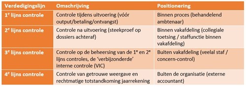 Zoals in bovenstaande de tabel te zien is, vallen de 1e en 2e lijns verdedigingslinies binnen de vakafdeling die verantwoordelijk is voor het (te controleren) proces. Vanuit de insteek van ‘integraal management’ is een manager verantwoordelijk voor de rechtmatigheid en getrouwheid van zijn processen. In de praktijk – mede gezien de sinds 2004 historisch gegroeide situatie – ligt de verantwoordelijkheid voor de controles achteraf (2e lijn) vaak nog bij afdeling financiën. Het risico bestaat zo dat de vakafdeling onvoldoende verantwoordelijkheid voelt of neemt voor de (financiële) rechtmatigheid, en dat dus bij vragen of opmerkingen hierover simpelweg wordt verwezen naar afdeling financiën.